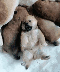 肚子饿得咕咕叫,奶水又香得不行,翻身还翻不过来,毫无办法的小奶狗只好在原地蹬腿儿,小屁股扭来扭去,试图占领一片自己的位置。